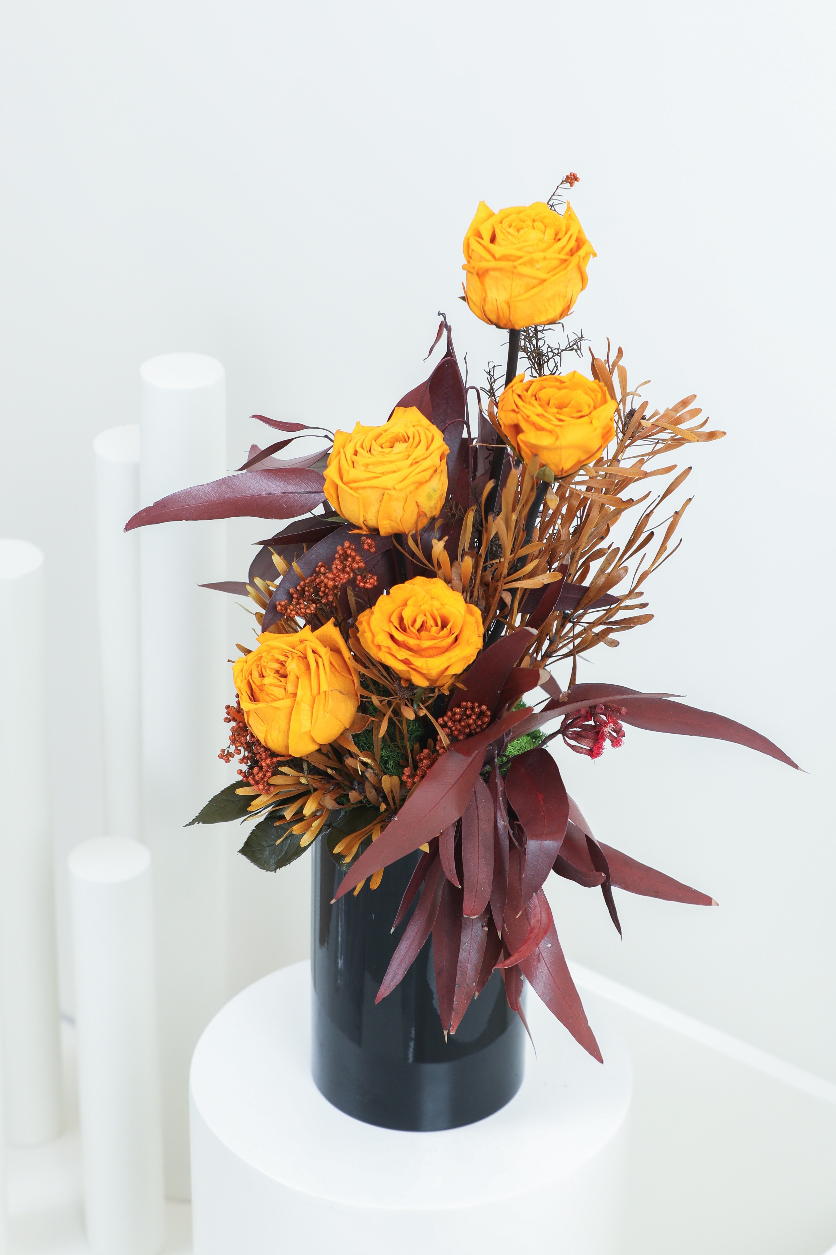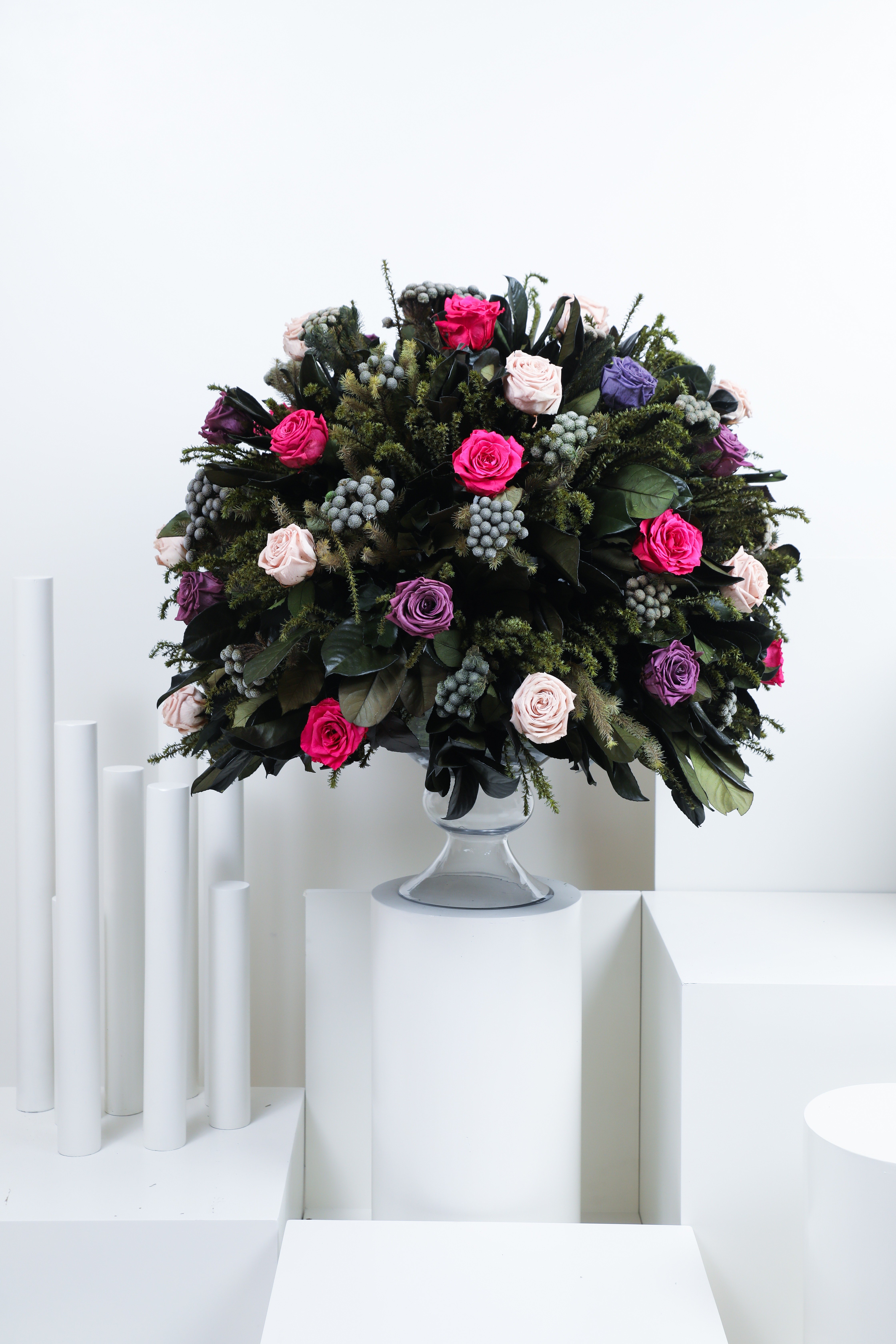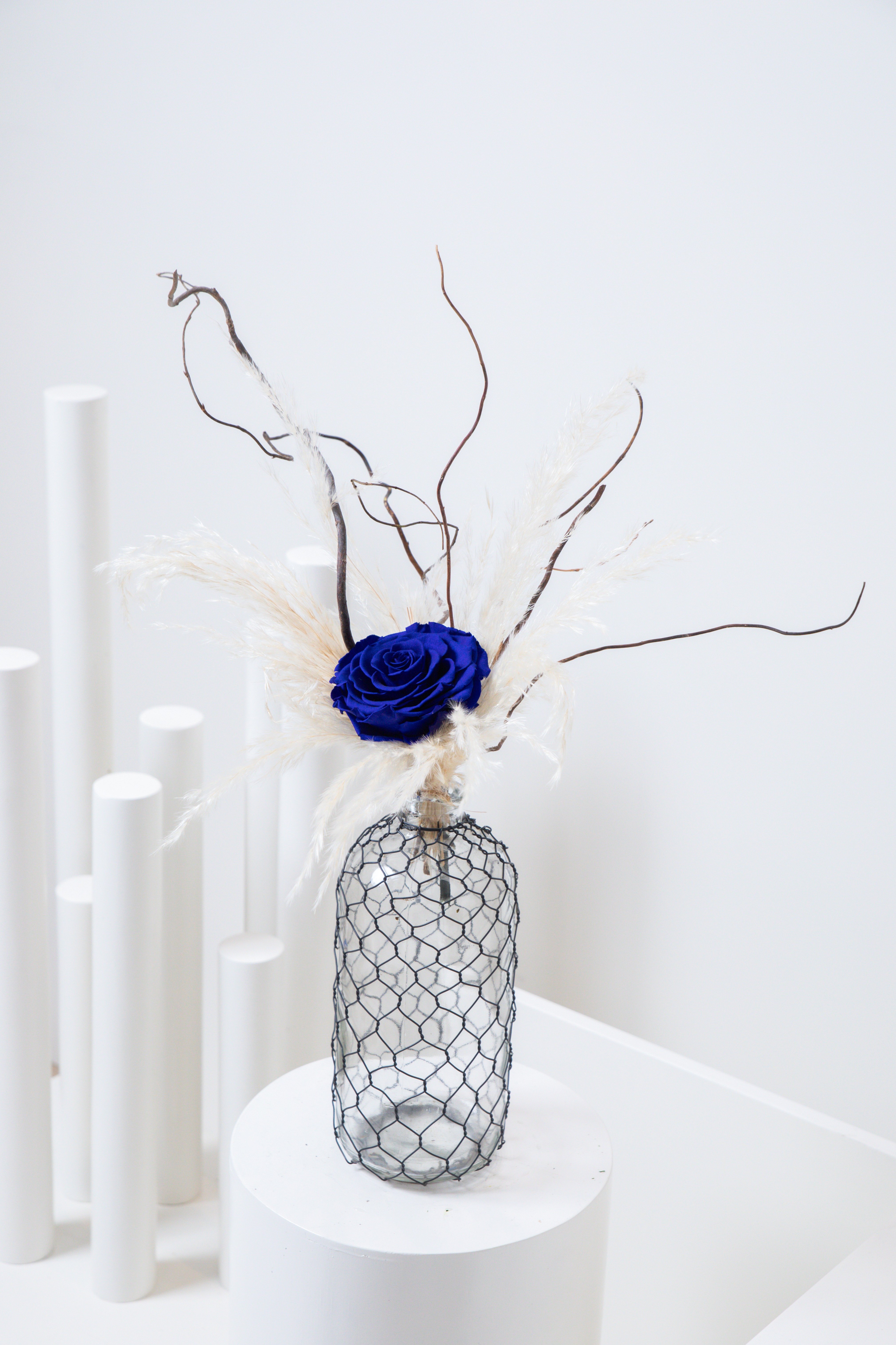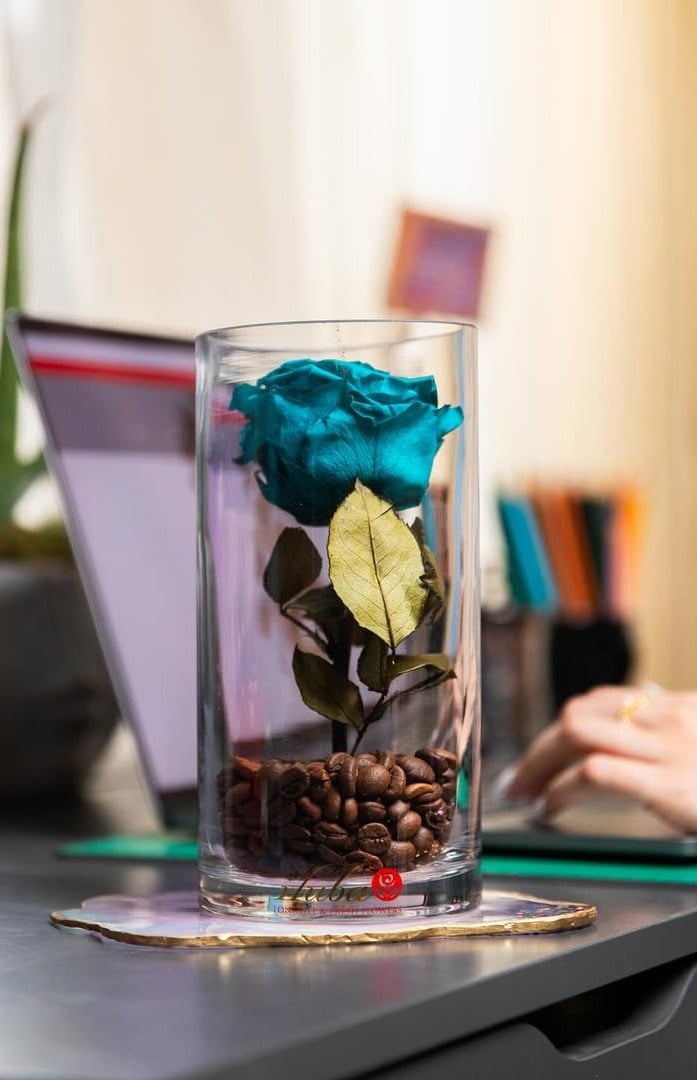 نوصي بشدة بإبقاء الورد الدائم في الصندوق أو التنسيق الذي يأتي به. لقد تم تثبيته وتصميمه بعناية ليكون قطعة فنية متكاملة، وإخراجه قد يعرضه للتلف ويقلل من عمره الافتراضي.