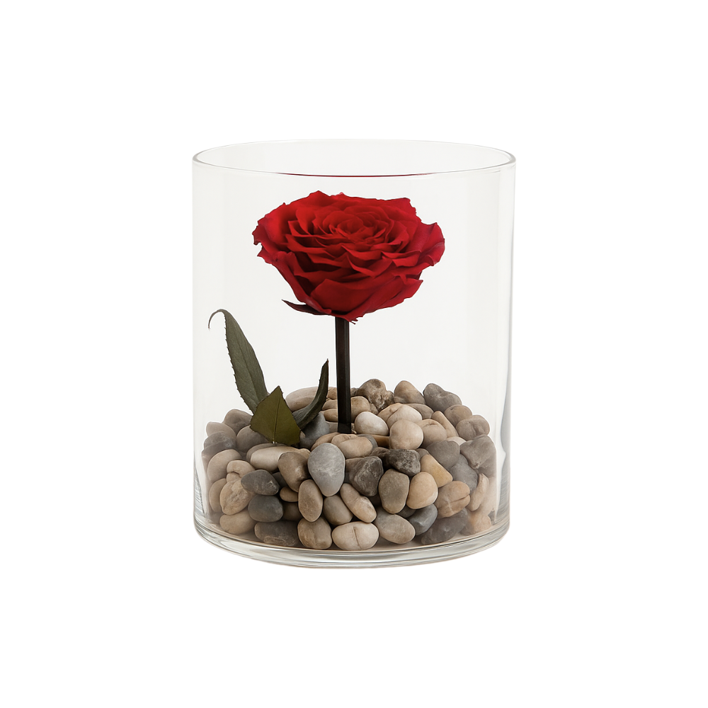 وردة جوري كبيره دائمة متوفرة بعدة خيارات للون الورد، منتج طبيعي يدوم لفترة 12 شهر وأكثر في فازة زجاجية كبيره شفافة يملؤوها الحجر ومتوفر بعدة اضافات داخل الفازة رمل ناعم، رمل خشن، حجر، زرع، بتلات ورد، حبوب القهوة، مقاس المنتج بالطول 20سم بالعرض 15 سم.