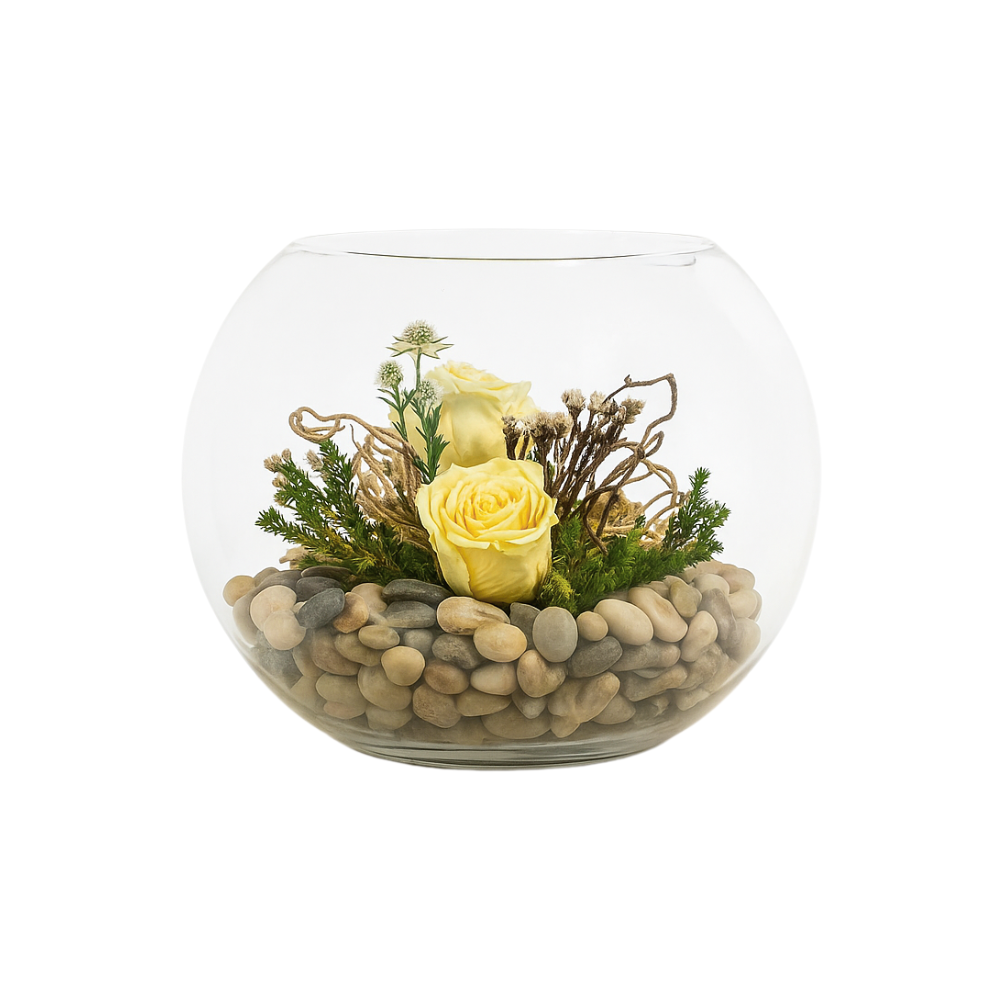 خمسة ورود دائمة تعيش أكثر من سنة مع تشجير أنيق في فازة زجاجية كروية